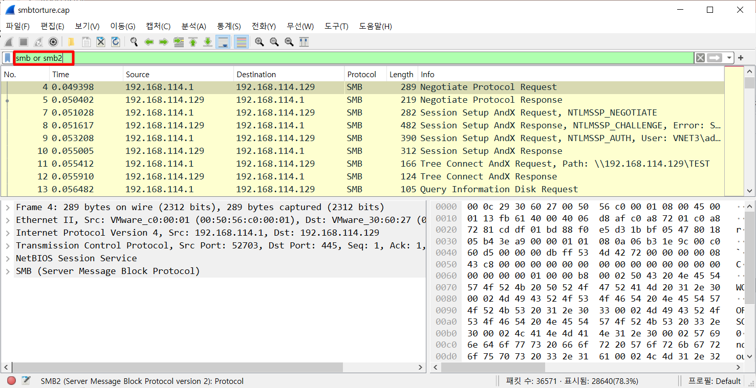 파일을 오픈하고 smb or smb2라고 필터창에 입력하면 smb패킷만 확인이 가능하다.