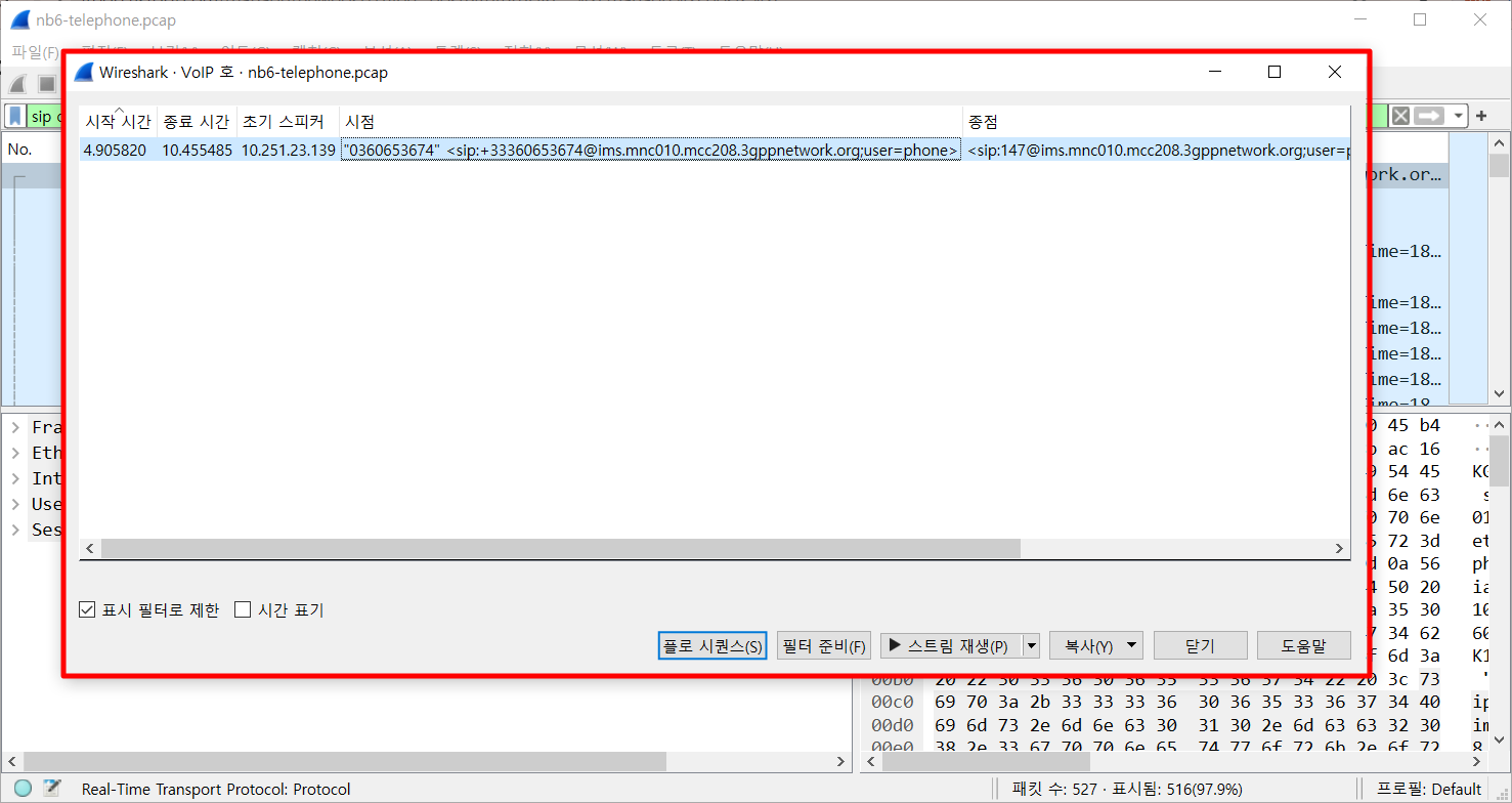 아래와 같이 VoIP로 통신한 음성이 존재한다. 스트림 재생 버튼을 클릭.