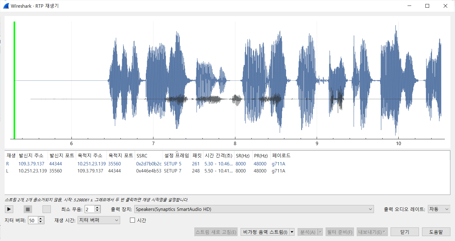 스트림 재생을 클릭하면 아래와 같이 RTP재생기가 오픈된다. 재생해서 실제 통신된 음성을 확인 가능.