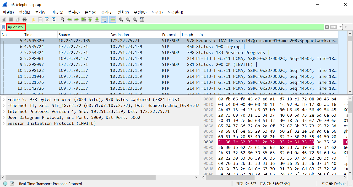 sip, rtp로 필터를 걸어서 세부 내용을 확인해볼 수도 있다.