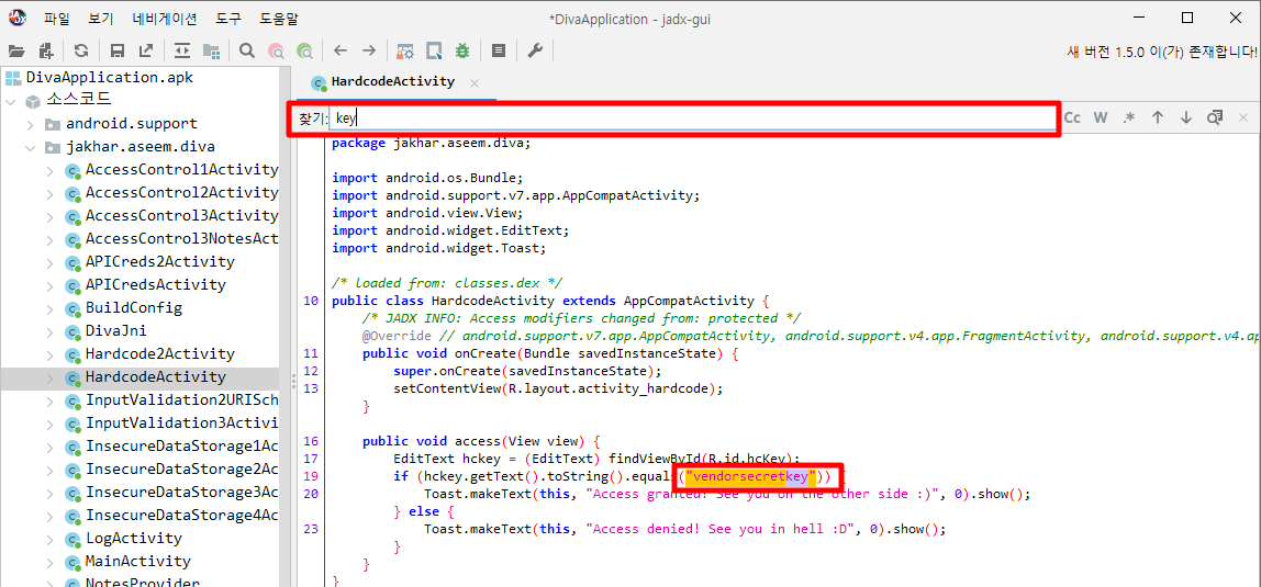 jadx로 소스코드를 확인하면 바로 하드코딩된 key값을 확인 가능하다.