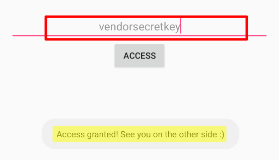 입력값에 바로 소스코드에서 확인한 vendorsecretkey를 입력하면 Access granted! 라는 문구를 확인 가능하다.