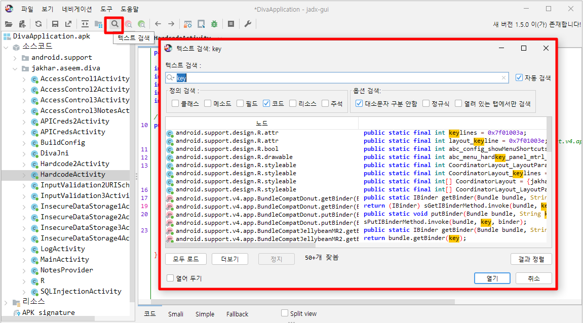 jadx에서 하드코딩된 정보를 [ ctrl+f ]로 열려있는 탭에서 찾을 수 있거나,