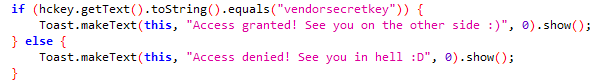 vendorsecretkey와 입력한 문자열이 같으면 Access granted! , 같지 않으면 Access denied!라는 문구를 띄운다는 코드.