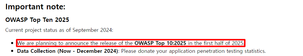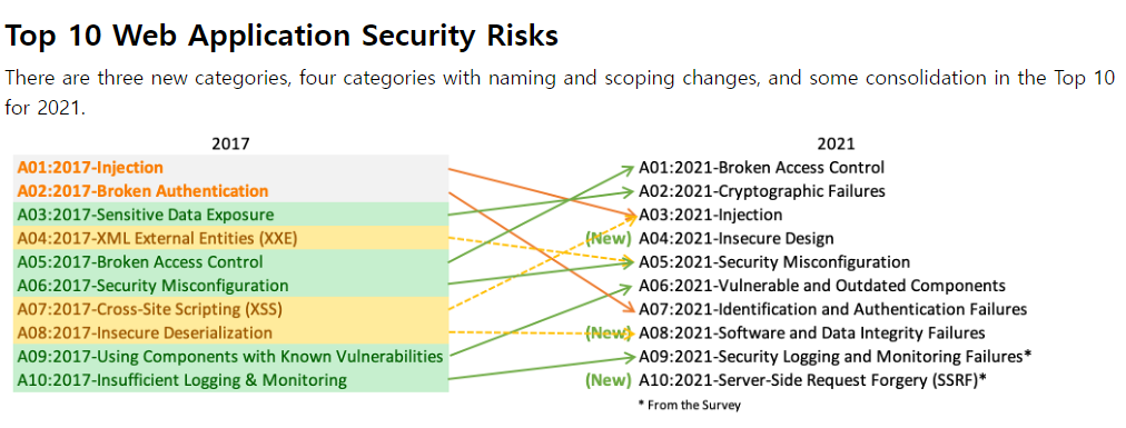 아래와 같이 OWASP TOP 10은 2017년에서 2021년도에 개정이 됐었던 걸 보면, 4년주기로 갱신을 하는 것 같다.