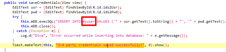 메시지가 뜨는 Toast문이 포함된 함수에 사용자가 입력한 데이터가 INSERT INTO myuser 라는 SQL구문을 통해 myuser라는 테이블에 삽입되는 것을 확인 가능하다.