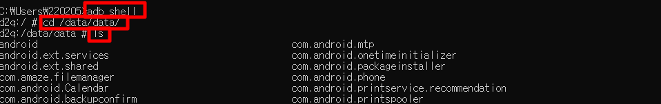 | adb shell cd /data/data/ ls |
