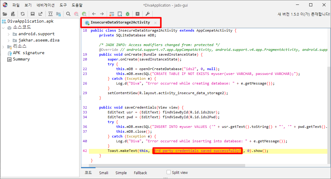 JADX 툴로 해당 메시지를 찾아보자. 검색값이 4개 나오는데 딱 봐도 InsecureDataStorage2Activity가 나온다.