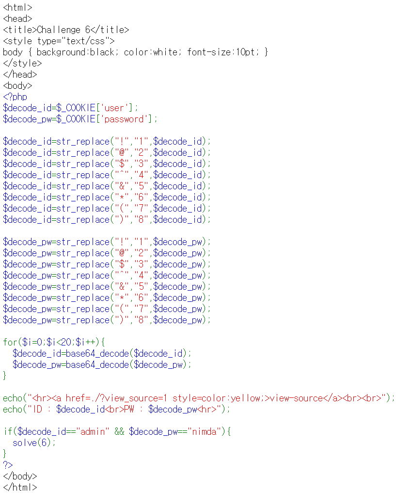 이때 해독된 ID가 admin이고 PW가 nimda일 경우 solve(6)을 호출하고 있다.